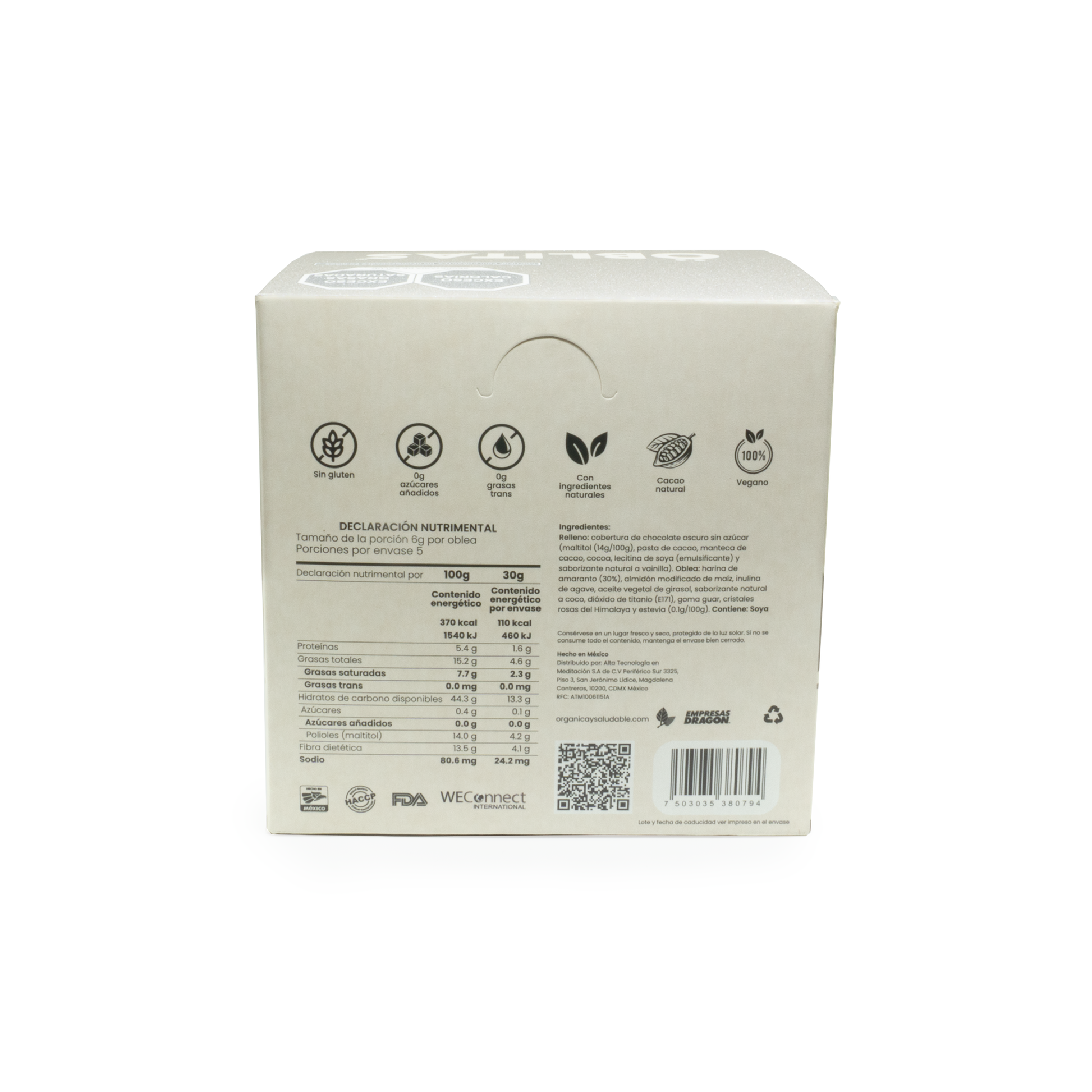Snack saludable: 5 Obleas por empaque sabor Coco rellenas de chocolate amargo sin azúcar con harina de amaranto.