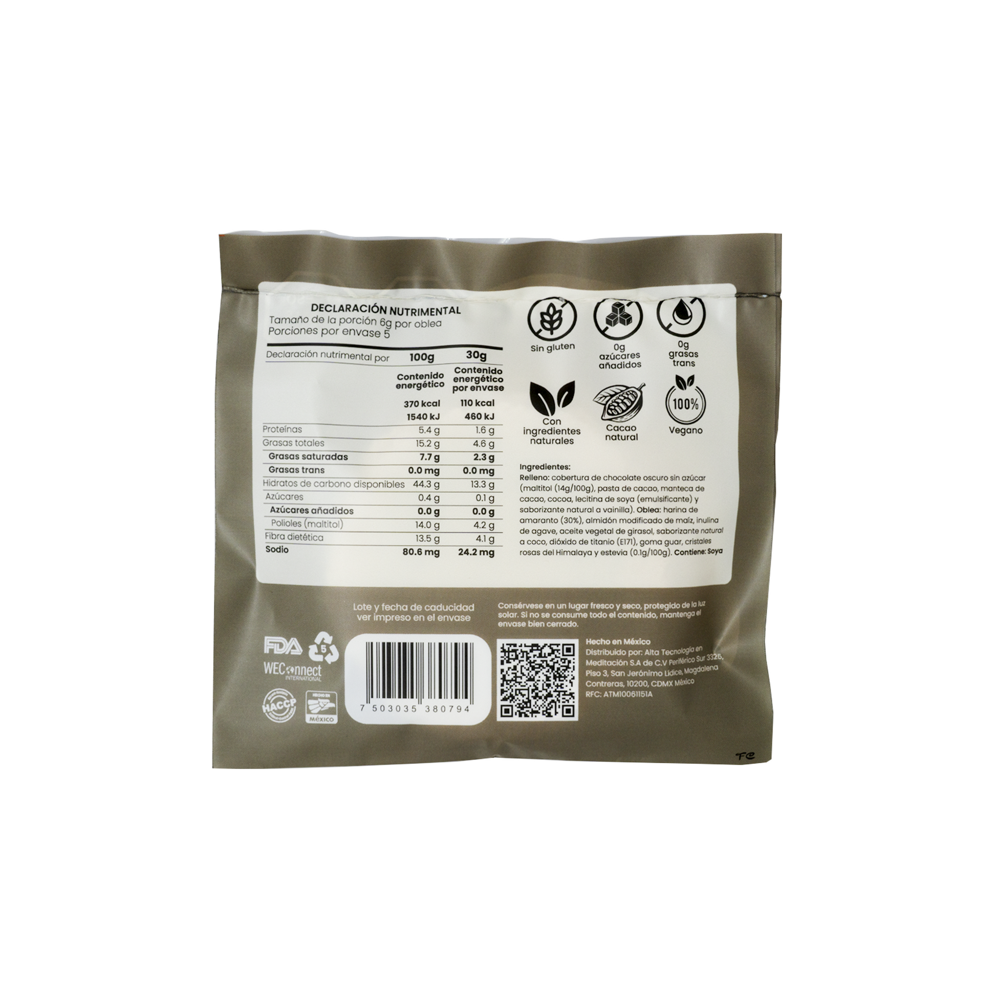 Disfruta de las Obleas Circulares, elaboradas con harina de amaranto y rellenas de chocolate semiamargo 60% cacao. Su receta sin azúcar y proceso de doble centrifugado reducen la grasa y el sodio, ofreciendo un snack saludable y delicioso. Perfectas para cualquier ocasión, combinan salud y sabor en cada mordida.