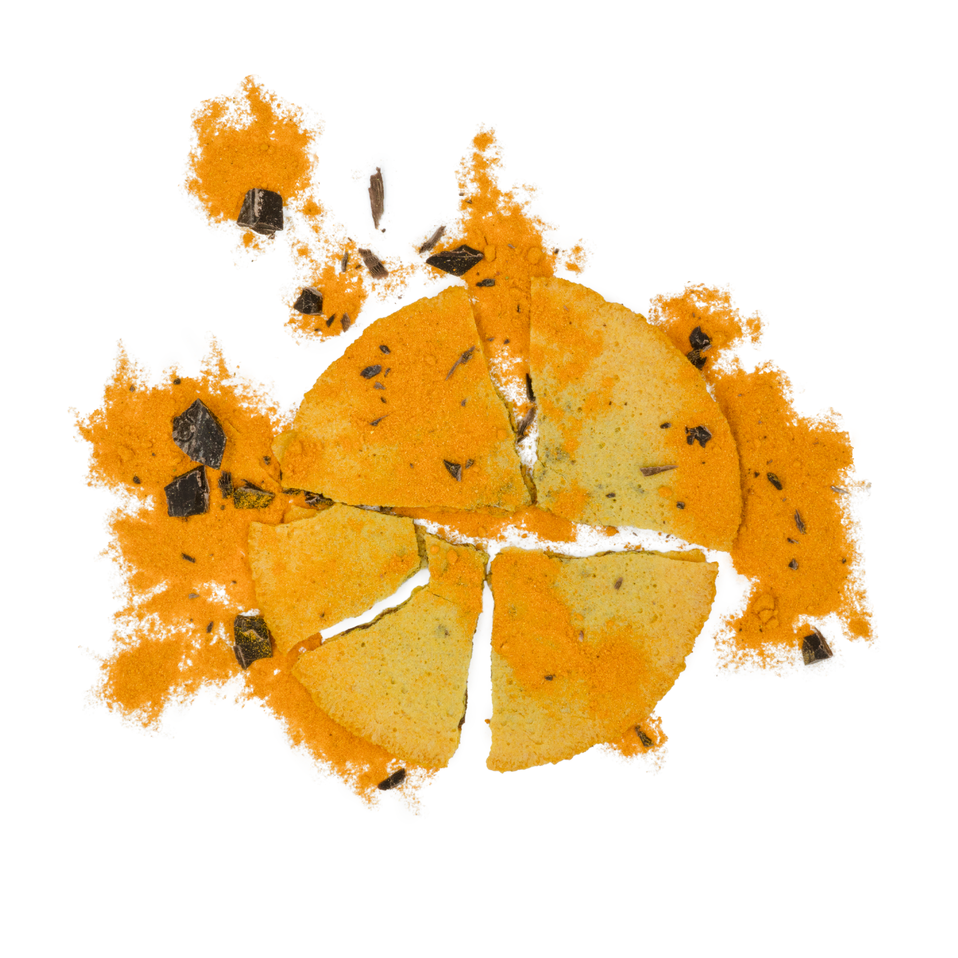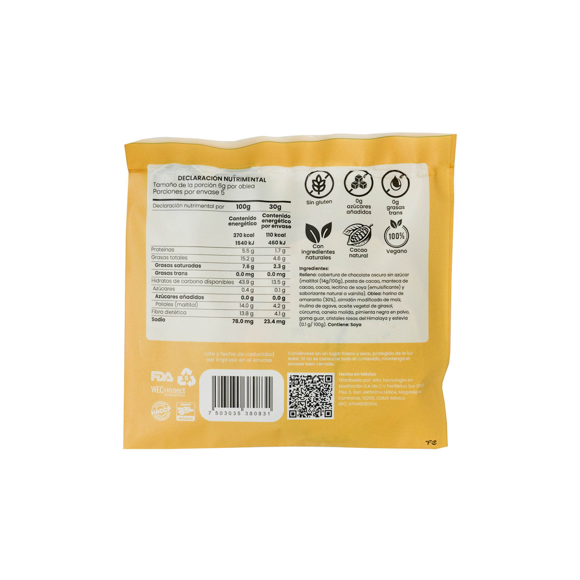 Snack saludable: 5 Obleas por empaque sabor Golden Milk (Cúrcuma) rellenas de chocolate amargo sin azúcar con harina de amaranto.